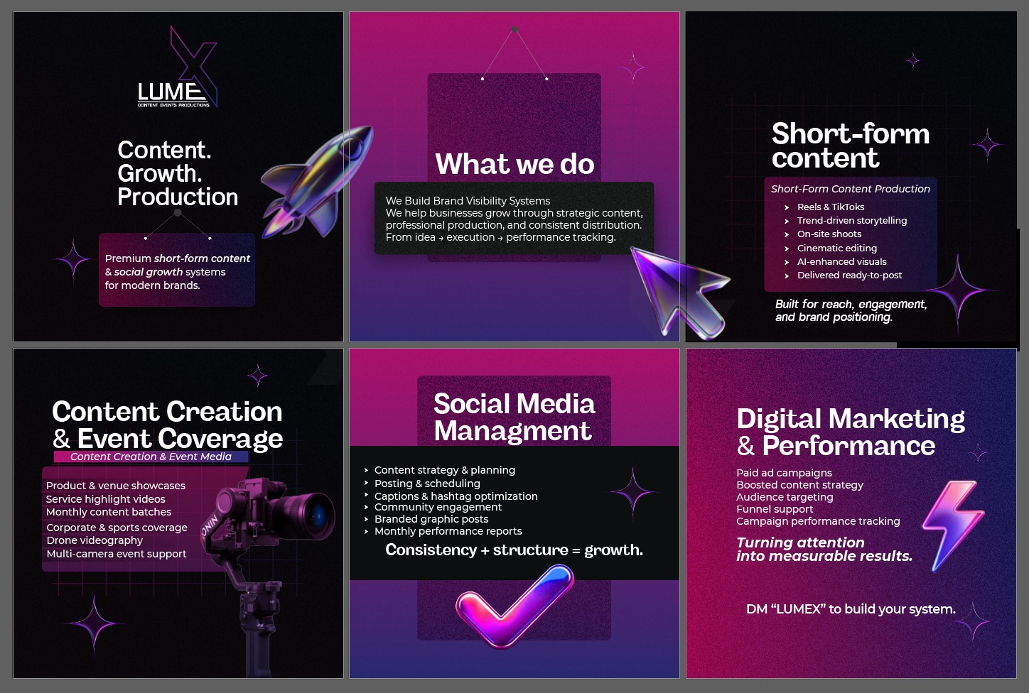 LumeX Creative brings together media production, social media management, and digital marketing consulting under one premium creative direction. We help ambitious businesses build a brand presence that feels elevated, modern, and commercially useful.